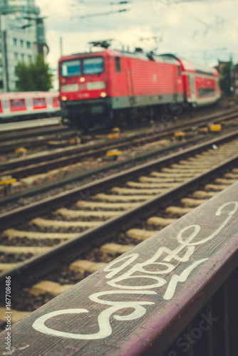 Obraz premium Blurred arrived red train und rails in front. Hamburg