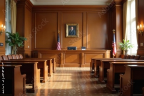 Fototapeta premium Blurred background of empty courtroom with soft lighting and elegant decor,...