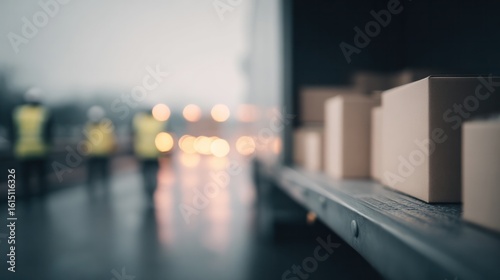 Obraz premium Blurred Background of Packages on Delivery Truck with Workers in High Visibility Vests for Transportation and Logistics Contexts