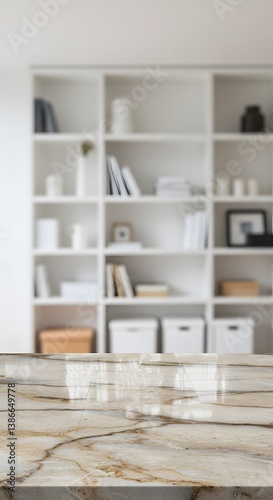 © Adobebaloch, Fototapeta premium blurred background, white bookshelves, living room interior, Marble counter with copy space for your product in blurred living room background, Marble wooden tabletop,