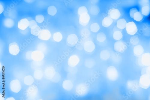 Fototapeta premium Blurred blue sparkling festive bokeh background. Trendy 2020 year color
