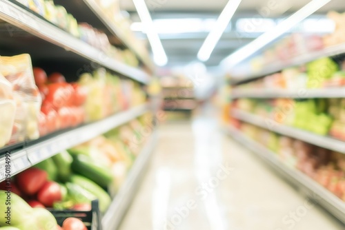 Fototapeta premium Blurred Bright supermarket aisle with fresh produce and neat shelves