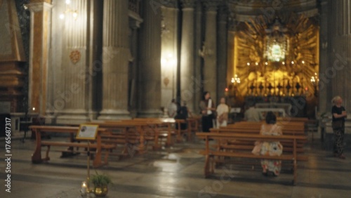 Fototapeta premium Blurred church interior with soft shallow bokeh and defocused altar, pews and...