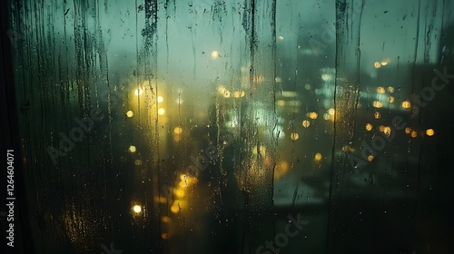 © comando, Naklejka premium Blurred City Lights Through a Rain-Streaked Window on a Gloomy Night