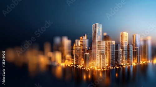 © Image4u, Fototapeta premium Blurred city skyline with illuminated buildings at dusk.