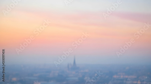 Fototapeta premium Blurred city sunrise, hazy skyline, distant spire, peaceful morning
