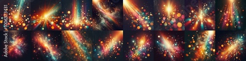© vector_master, Obraz premium Blurred colorful warm rainbow light flares on a black background with a dust texture. AI generated illustration