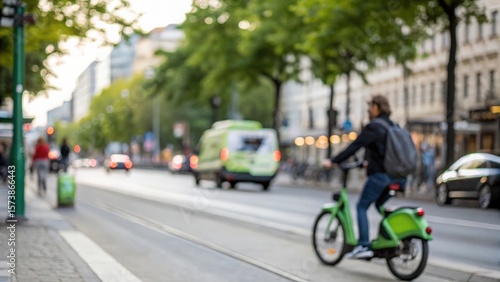 © N7, Fototapeta premium Blurred eco-friendly city scene with green transport symbolizing carbon reduction and sustainability