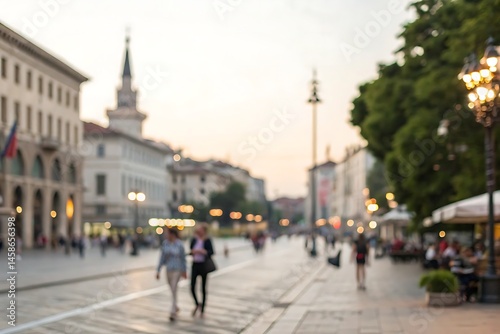 Naklejka premium Blurred evening stroll city square people walking urban environment warm glow