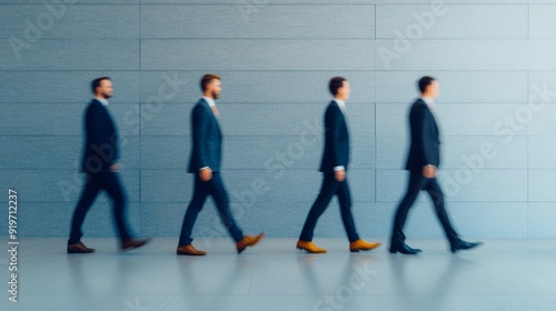 © TEERAPAT, Obraz premium Blurred figures of business professionals networking in modern conference hall, dynamic composition, intense motion blur