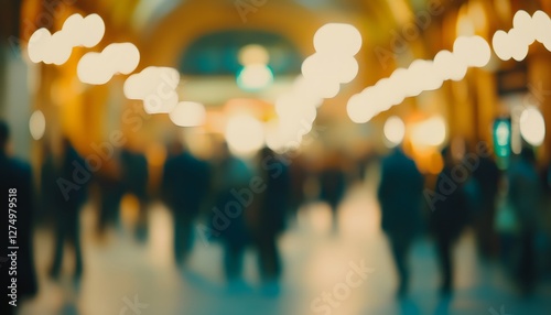 Fototapeta premium Blurred figures walk under soft lights in a grand hall