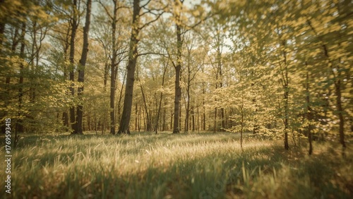 © Lasvu, Fototapeta premium Blurred forest with trees and grassy ground in a natural woodland scene.