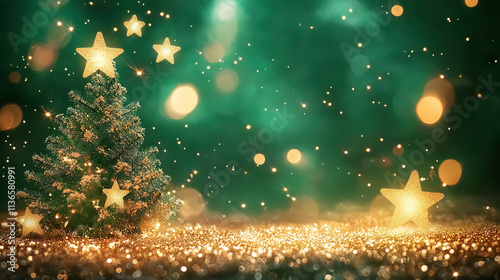 Naklejka premium Blurred green glittery Christmas texture with twinkling stars, glowing festive sparkles, rich and shimmering light effects
