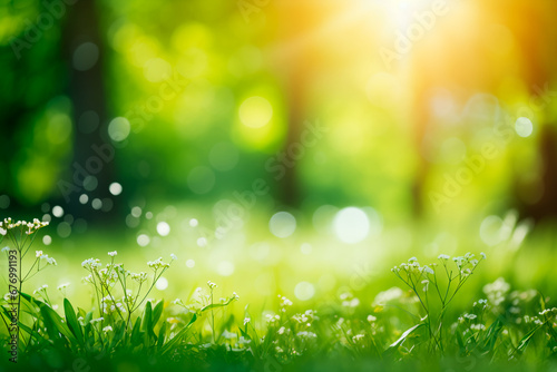 © Uliana, Obraz premium Blurred green trees in a forest or park with wild grass and sunlight. Scenic summer-spring natural background.