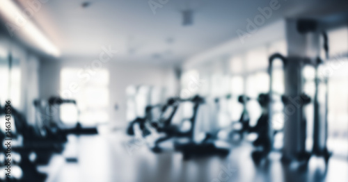 © al-sultan, Fototapeta premium Blurred gym interior with exercise equipment and large windows providing natural light.