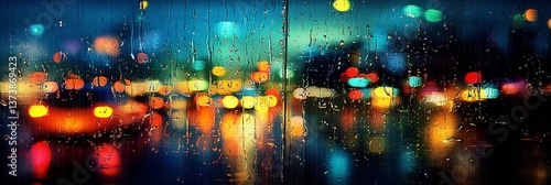 © BZXO, Naklejka premium Blurred headlights from car traffic reflect on windows during a rainy autumn night.