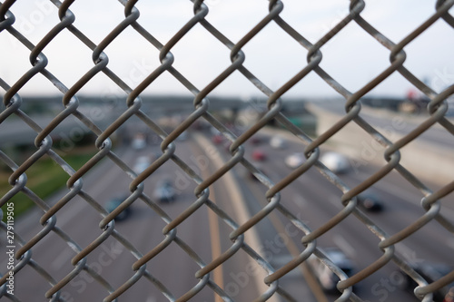 Fototapeta premium Blurred highway view through a metallic fence
