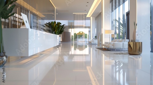 Fototapeta premium Blurred hotel or office building lobby blur background interior view toward reception hall modern luxury white room space with blurry corridor and building glass wall window : Generative AI