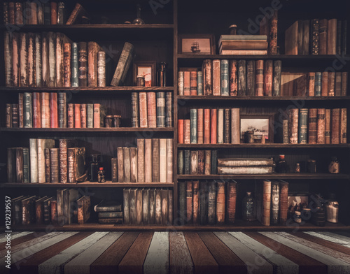 © escapejaja, Fototapeta premium blurred Image Many old books on bookshelf in library