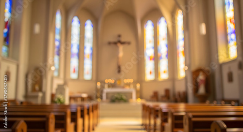 © MUZAQI, Fototapeta premium Blurred interior of a sacred church with pews leading to a luminous altar and colorful stained glass windows, evoking a sense of spiritual tranquility and solemn contemplation