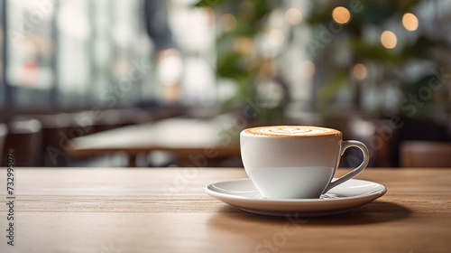 © Nikkikii, Obraz premium Blurred modern background, a cup of coffee on a wooden tabletop. GenerativeAI