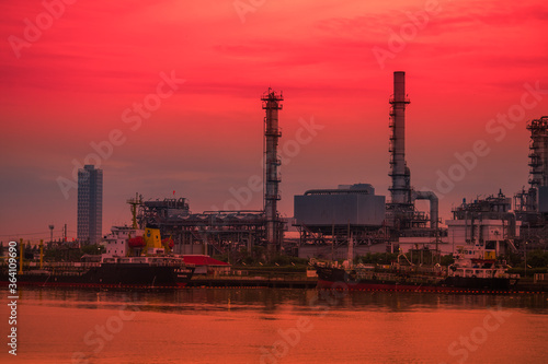 © bangprik, Fototapeta premium Blurred natural background of the morning sunshine along the river, breathtaking views (cargo ship, oil refinery), boat transportation