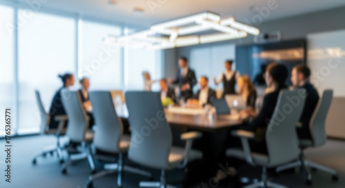 Obraz premium Blurred office background with business people in meeting room, abstract corporate environment for presentation backdrop, conference hall with team at work concept