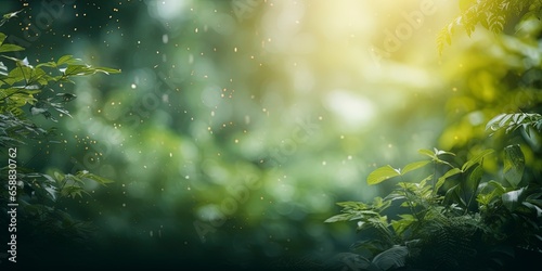 © W&S Stock, Naklejka premium Blurred out jungle forest abstract background with lots of bokeh and a sunrays and room for text