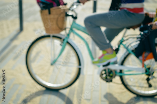 Obraz premium Blurred outdoors image of active family bike ride. Mother and child biking on...