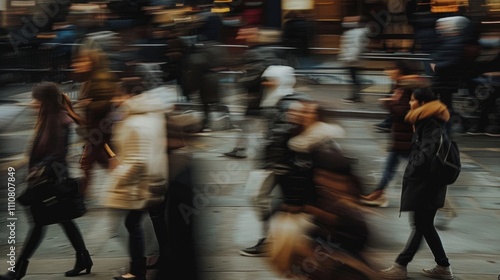 © Vladimir, Obraz premium Blurred people in motion are walking down the street. A blurred photo capturing a busy city street scene creating a sense of motion and energy.