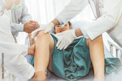 © ฺฺฺBoonterm, Obraz premium Blurred photo medical team takes care of pregnant women with care and analysis, aching muscles in the legs and allowing patients to relieve anxiety : Blurred background