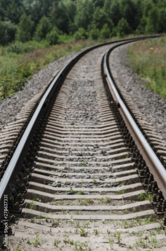Fototapeta premium Blurred railway turning right. Rails and sleepers close-up against a green forest. The way forward.