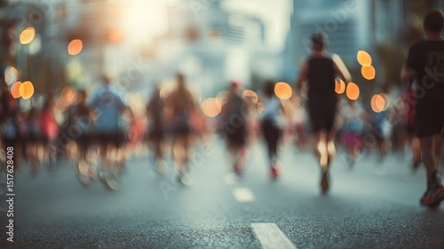 Fototapeta premium Blurred Runners City Street Marathon Race Event Urban Evening Athletes Running Competition Summer Sunlight Background Bokeh Lights Abstract Motion Dynamic Energy Active Lifestyle