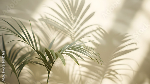 Naklejka premium Blurred shadow from palm leaves on light cream wall. Minimalistic beautiful...
