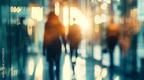 Fototapeta premium Blurred silhouettes of busy professionals in modern office setting, abstract...