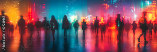 © HQAsset, Fototapeta premium Blurred Silhouettes of People Walking in a City with Neon Lights and Reflections