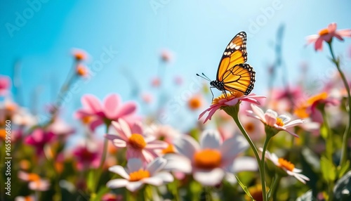© Chalermrach, Fototapeta premium Blurred spring glade, blooming flowers, butterfly, sunny blue sky, sunlight, vibrant