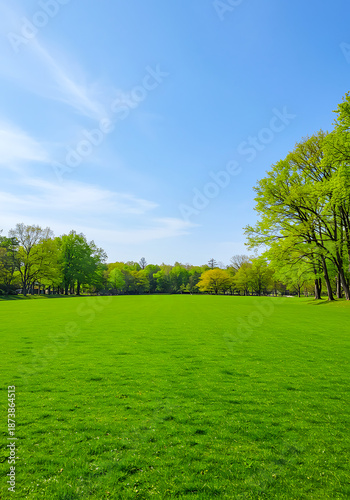 Obraz premium Blurred Spring Nature Background with Green Lawn, Trees, and Blue Sky on Sunny Day