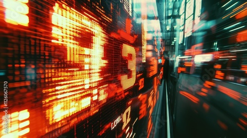 Fototapeta premium Blurred Stock Market Display with Glowing Numbers and Data Streams Amidst a Futuristic Technology Environment in Urban Setting