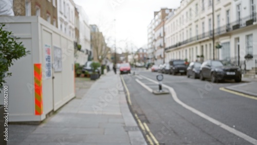 Fototapeta premium Blurred street view in london captures urban ambiance with cars, buildings,...