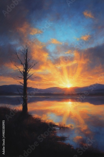 Fototapeta premium Blurred sunset over tranquil waterscape abstract background