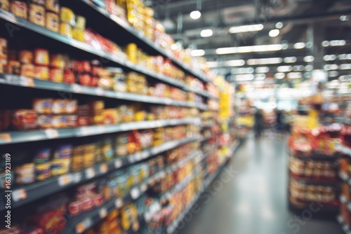 © Goopy, Fototapeta premium Blurred supermarket aisle with food products on shelves