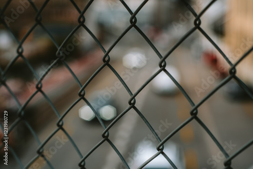 © Octavian, Fototapeta premium Blurred two lane city traffic behind chain wink wire mesh grid or fence. Top, overpass point of view, close up shot, no people