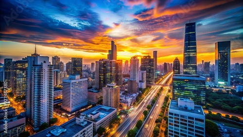© Man888, Fototapeta premium Blurred urban cityscape at dusk with modern skyscrapers and busy streets contrasting with a serene, gradient blue and orange sunset developing in the background.