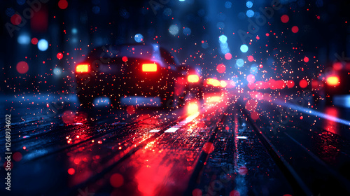 Fototapeta premium Blurred Urban Cityscape at Night with Car Lights and Reflections in Red and...