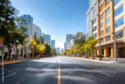© NANIK, Fototapeta premium Blurred urban view city street with a central yellow line and buildings lining both sides