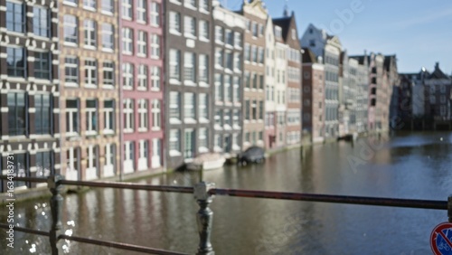 © Krakenimages.com, Naklejka premium Blurred view of amsterdam canals with defocused buildings and bokeh effect under a clear sky, creating a serene and picturesque dutch urban scene.