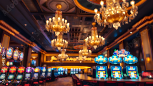 Fototapeta premium Blurred view of an elegant casino interior with luxurious chandeliers, slot...