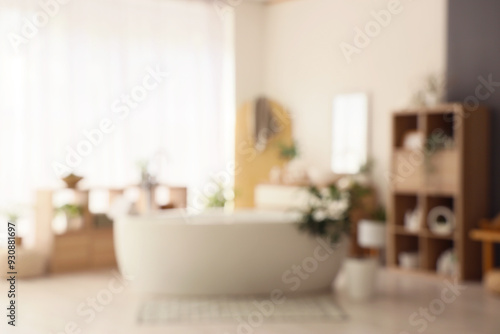 Fototapeta premium Blurred view of bathroom with bathtub, shelf units and plants