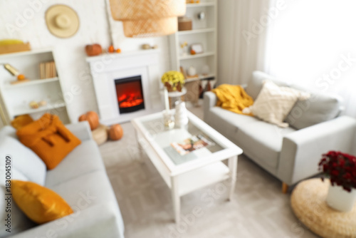 Fototapeta premium Blurred view of light living room with grey sofas, chrysanthemum flowers and fireplace